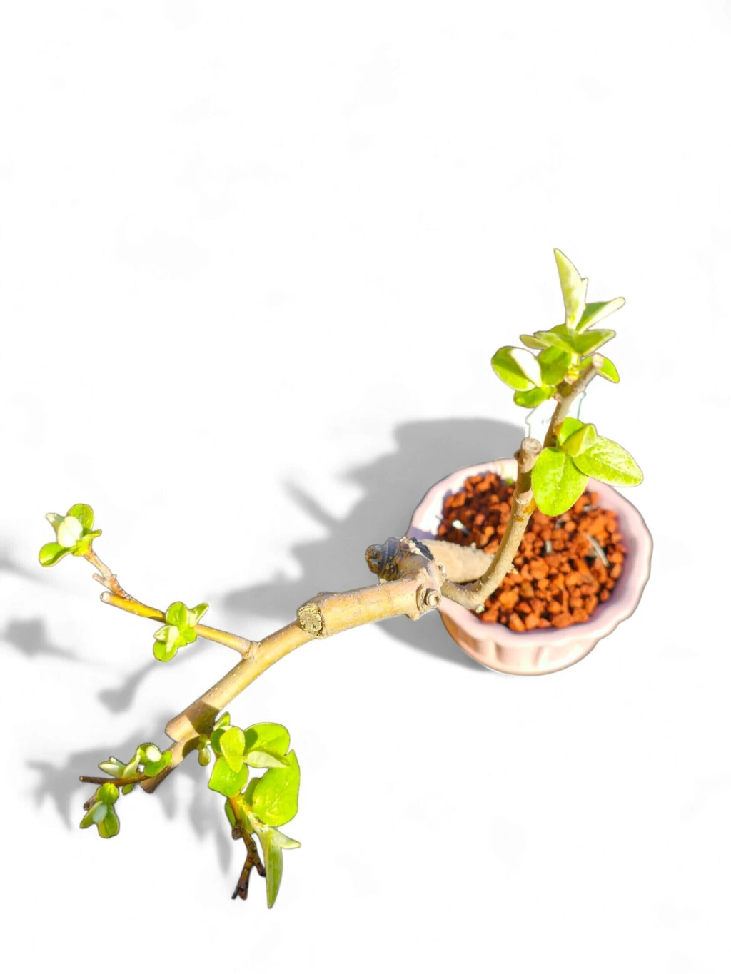 El membrillo es una especie frutal de hoja caduca muy valorada en bonsái por su floración abundante en primavera y sus frutos pequeños y aromáticos en otoño. Este ejemplar joven conserva una estructura básica definida, ideal para quienes quieren continuar su formación sin partir de cero. Sus hojas ovaladas y su textura aterciopelada aportan un carácter singular al árbol.